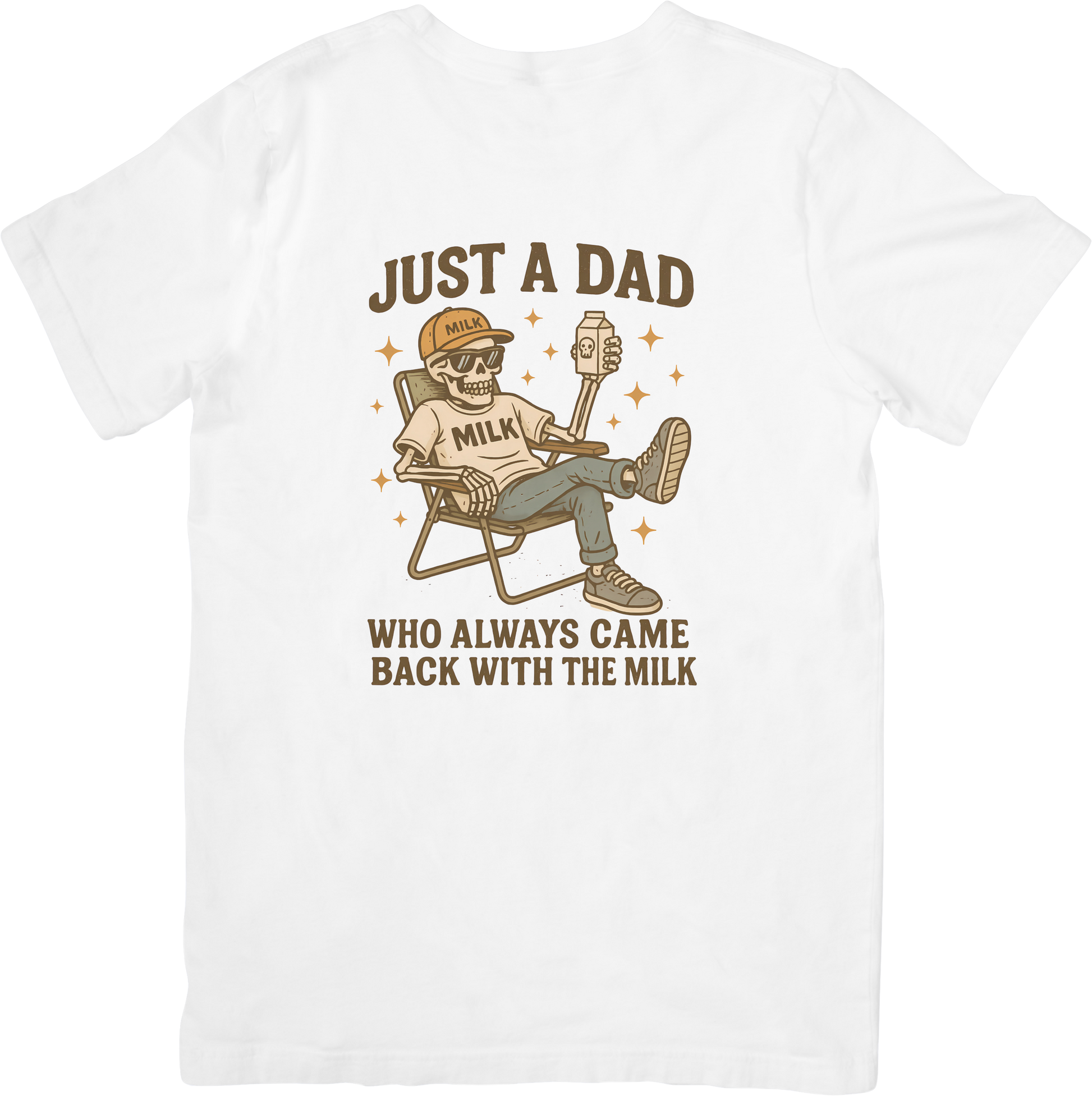 Celebrate the dad who actually showed up with this hilarious tee featuring a laid-back skeleton lounging in a lawn chair, milk in hand. Perfect for fathers with a sense of humor, this playful design flips the script on a classic joke with style. Soft, comfortable cotton blend keeps you cool whether you're cracking jokes at the barbecue or just living your best skeleton life. A conversation starter that proves some dads really do come through.