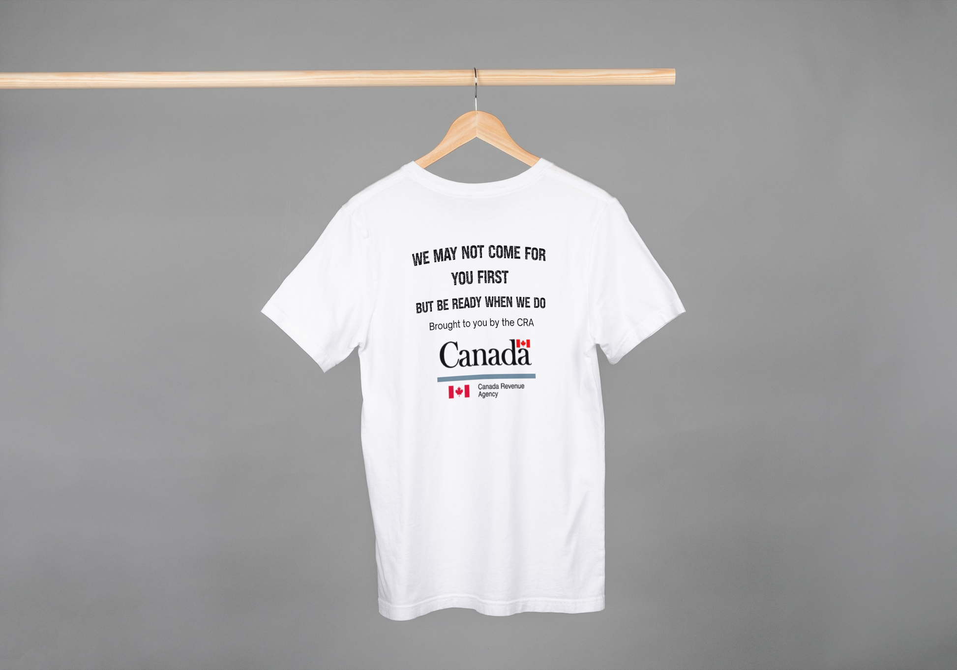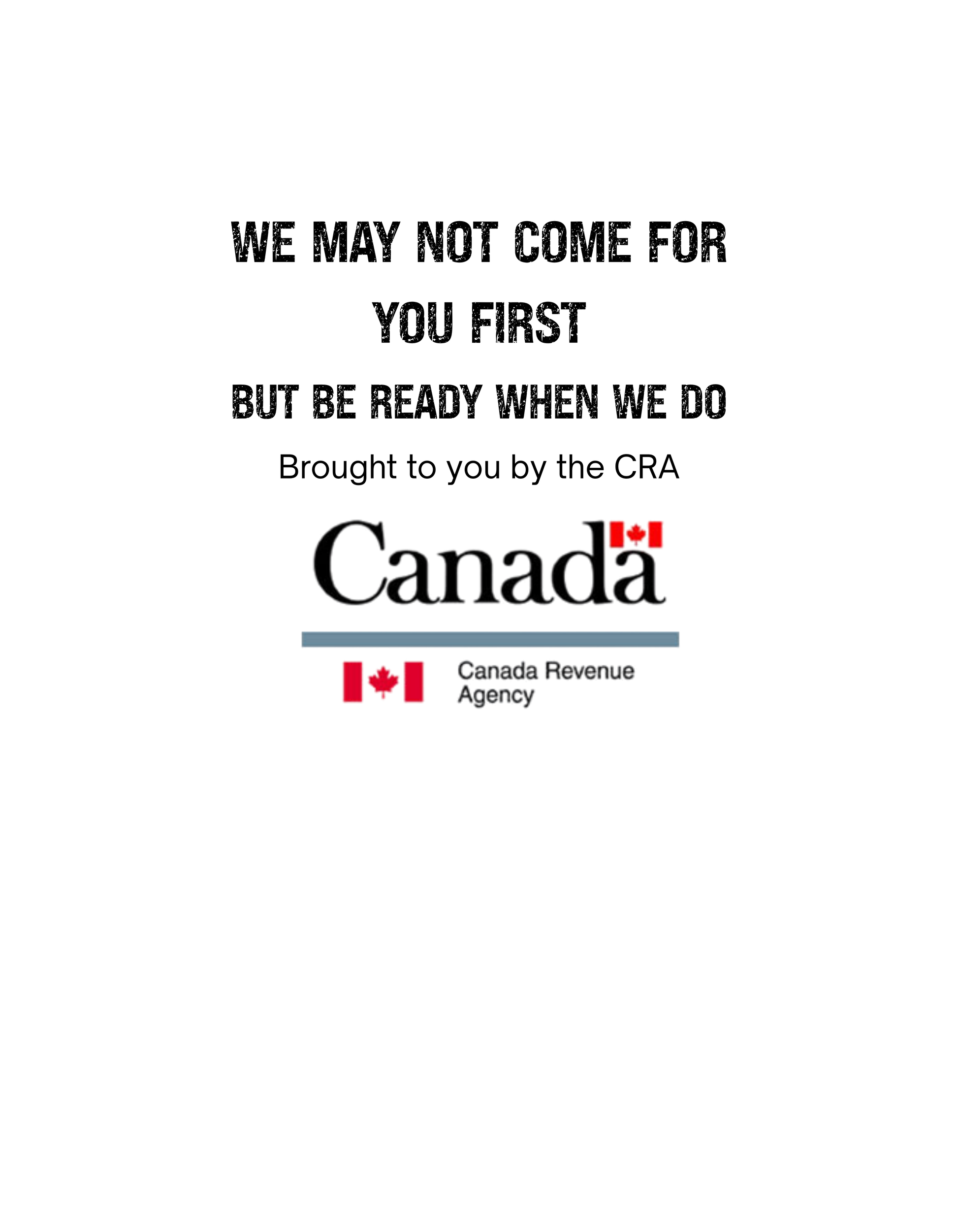 For anyone who's been on the receiving end of a CRA reassessment letter, this tee speaks your language. Featuring the darkly humorous message "We may not come for you first but be ready when we do. Brought to you by the CRA," it's the perfect way to laugh through the audit anxiety. Whether you're navigating COVID benefit clawbacks or just bracing for that dreaded letter, this shirt lets you wear your experience with wit and style. Comfortable, relatable, and cathartic—because sometimes humor is the best defense.